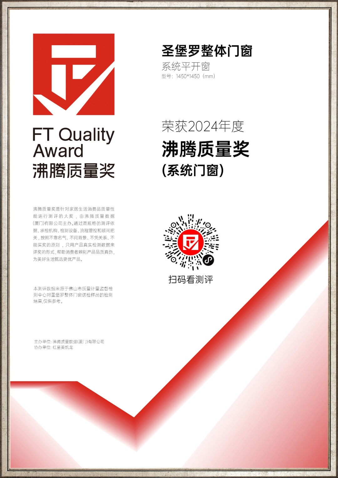 设计看红点,质量信沸腾! 近日,家居质量风向标“沸腾质量奖”公布新测评结果。 凭借卓越的性能和遥遥领先的产品品质,圣堡罗整体门窗自主研发生产的系统平开窗产品荣获2024年度沸腾质量奖(系统门窗)! 此...