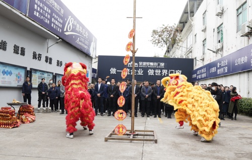 伴着鞭炮声、锣鼓声,醒狮起舞,给大家送去吉祥的锣鼓声,带来新年的鸿运。圣堡罗整体门窗董事长吴国洪为醒狮作了点睛,俗语有云“金鼓一响黄金万两、金狮点睛富贵繁荣”,预示着新的一年公司生意兴旺、财源滚滚。随后狮子腾空一跃,接青采寓意生财有道、步步高升。