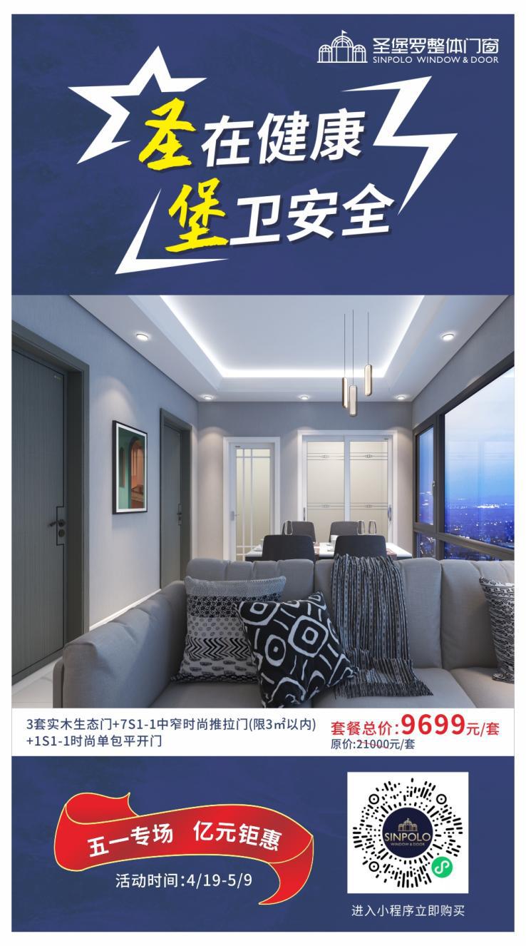 此次“圣在健康·堡卫安全”为主题的五一钜惠专场中,除了铝门、木门、窗户多款产品参与活动外,也推出了全屋门窗定制劲爆套餐,优惠多多,方便多多。