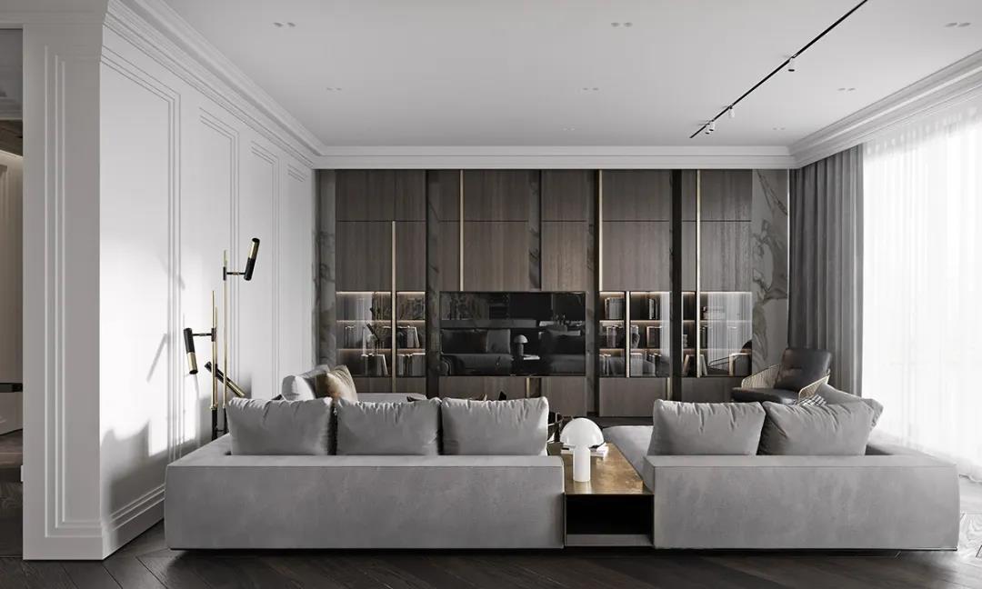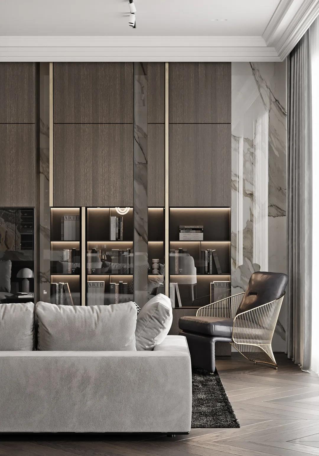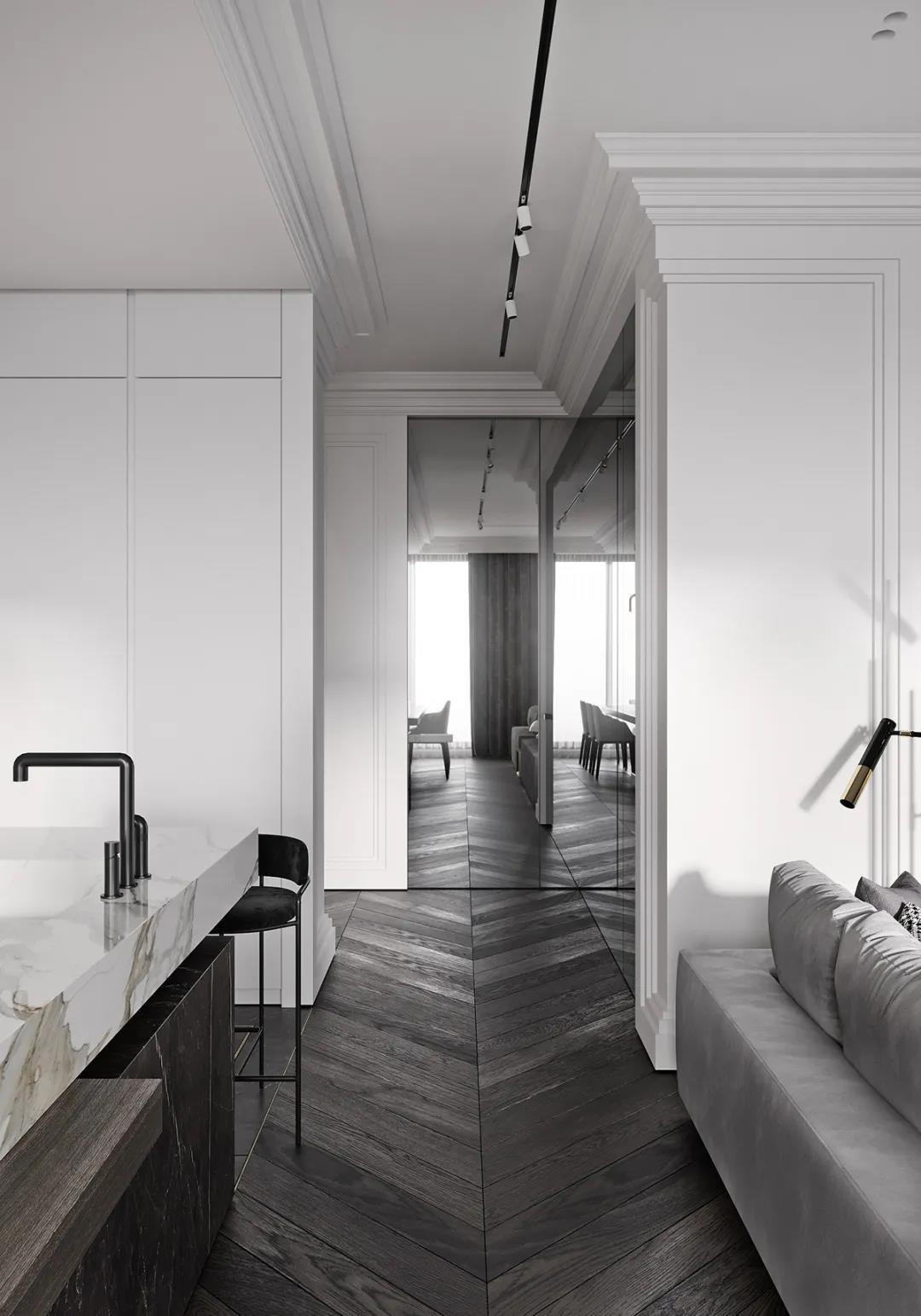开放式的布局将各功能区很好的融汇在一起,良好的采光可以照射进室内的每一角落,流通的空气也驱散了灰色调的压抑感,以灰黑色的搭配装饰厨房的墙面与天花,白灰色的大理石中岛吧台提亮了空间的色调,明与暗的色彩对比,鲜明又利落。