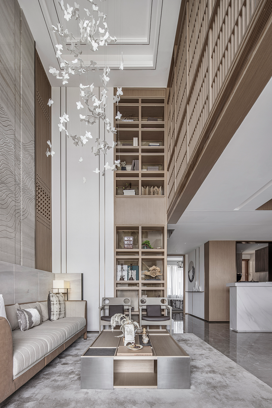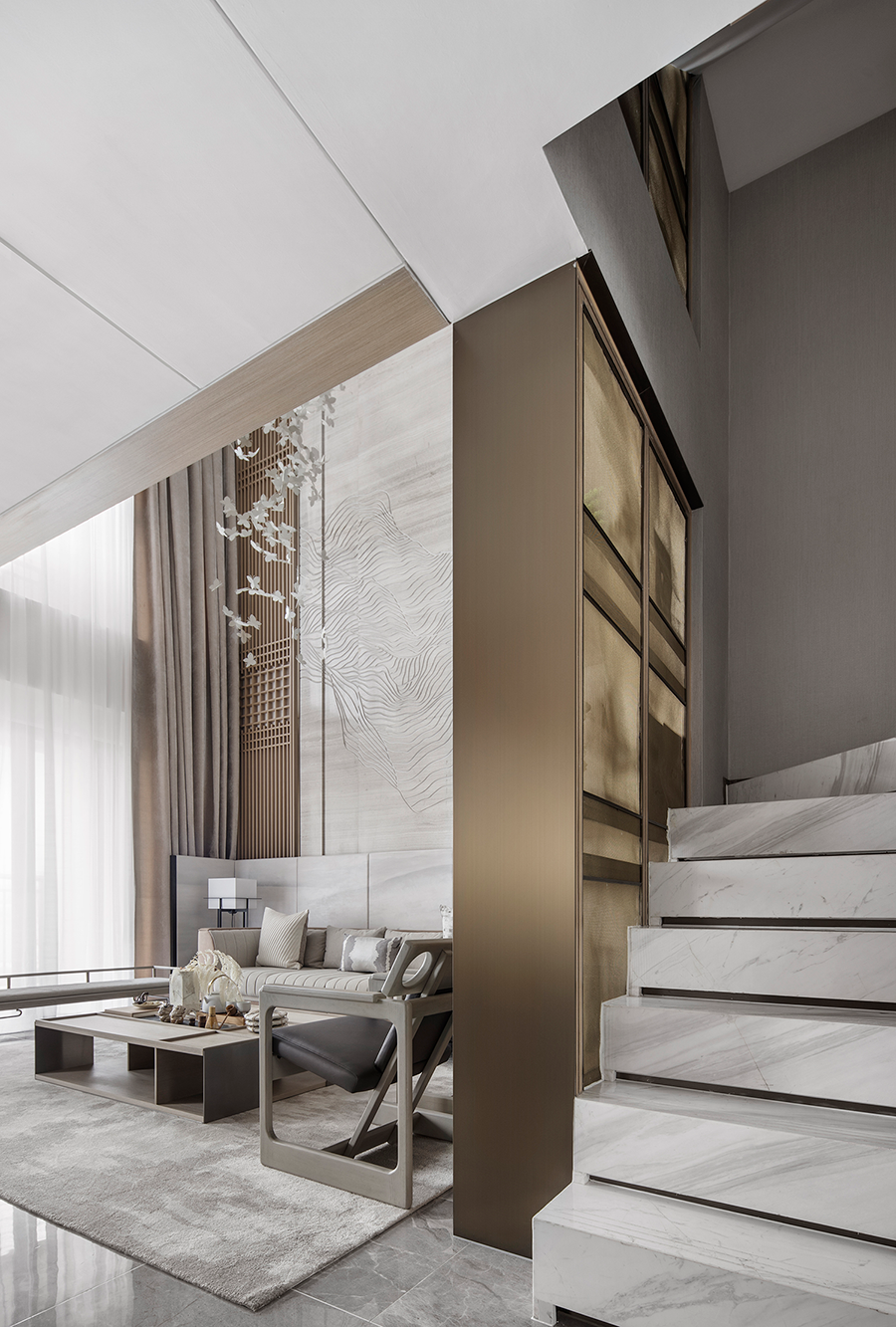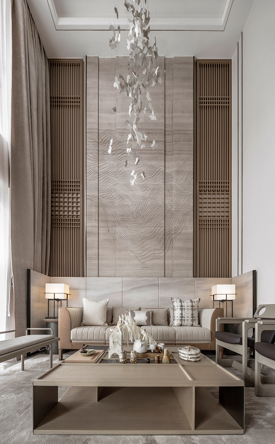 一层含有接待、聚会功能,我们在这层强调回归文韵礼序的宁静致远。就空间整体风格而言,偏向现代简约,设计语言采用直线条为主,块面的分割,给人通透干练的感受。